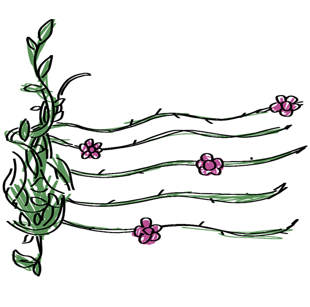 The flowers on the vines resemble the notes on the musical staff