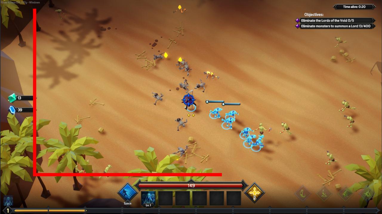 Realistically there’s only one simple step to the whole strategy. Head asap to a corner of the map, this is where enemies will spawn; they spawn at the borders of the map, so by being in a corner you’ll be as close as possible to two spawning borders. You want to alternate sitting in place with looping around the edges of the screen to pickup exp. Depending on the class you chose you might want to focus on specific abilities but overall, just choose damage, area, exp magnet…Full glass-cannon dmg only. Avoid armor, block and health, we’re not building for any late game.