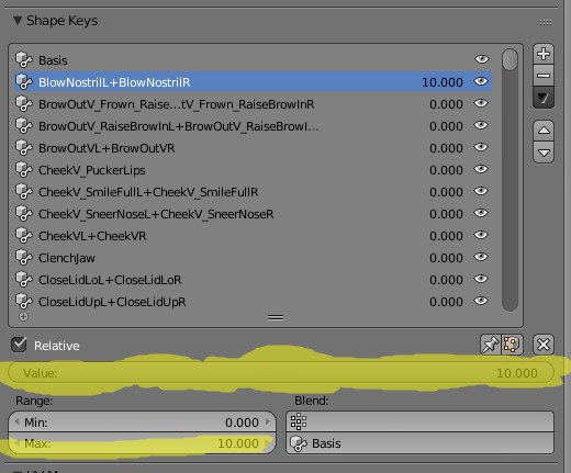 Select a shape key, set the max to 10 and Crank the value up as far as it goes