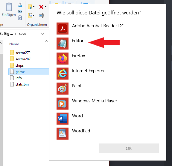 There you select the “save” folder in there should be a file called “Game”. - Now double click on the file and open it with the Editor