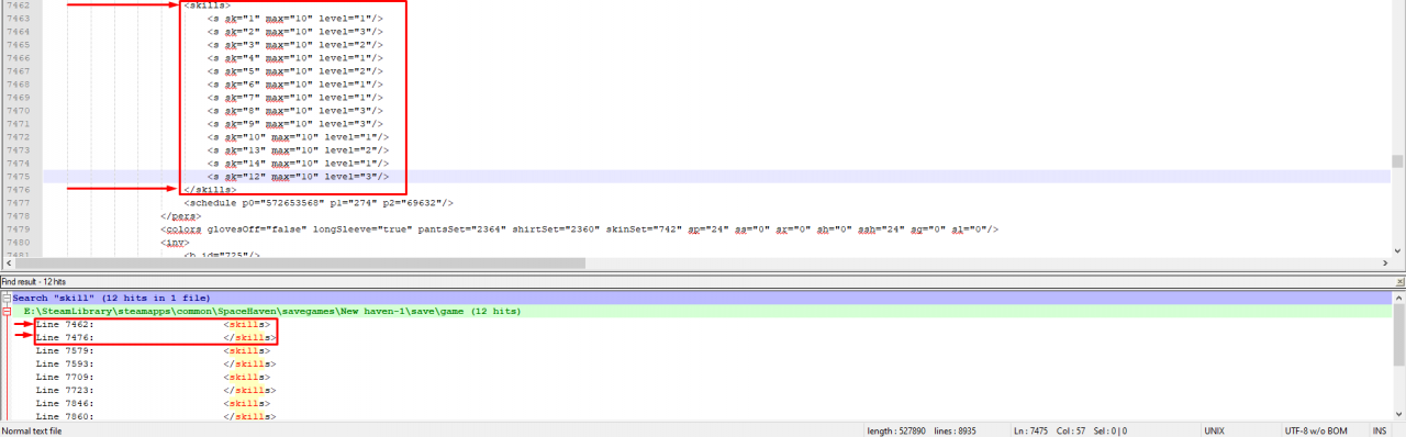 4. Now we have a list of all the search has found in the file. So we see <skills> and </skills>. So we click on the first entry <skills>, and it will take us to the skills of one of our crewmembers.