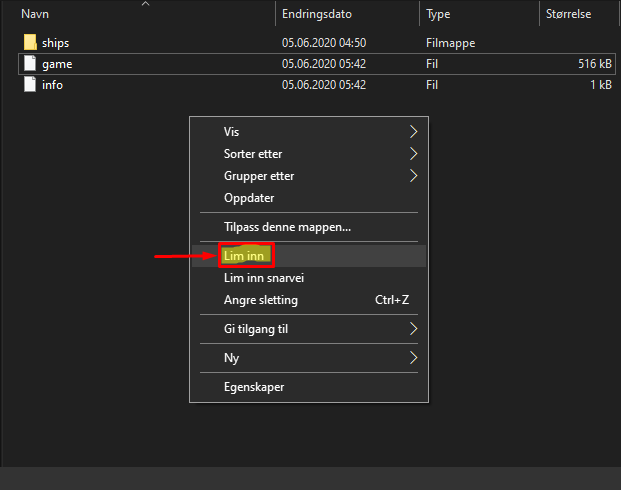 2. Ctrl-V or right click on an empty space in the folder, and click paste. (In Norwegian “Lim Inn”)