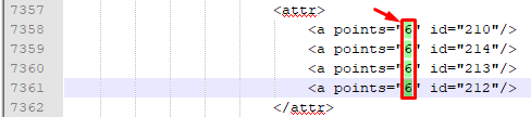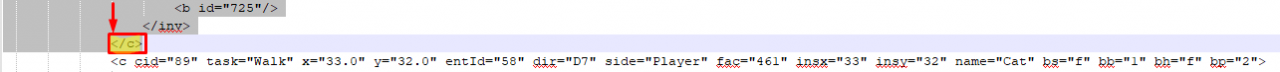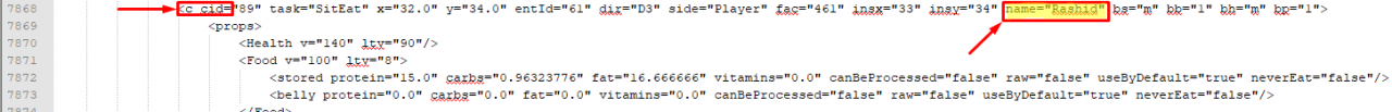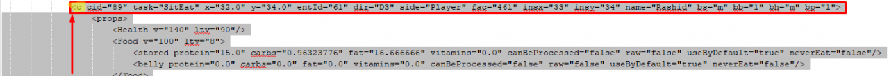 5. To check which crewmember we are editing, scroll up until you see <c cid=… in row 4, and look for name=…
