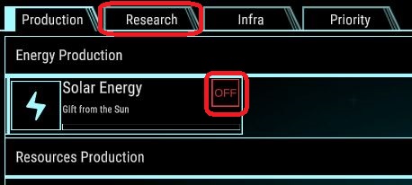 For now turn the “Solar Energy” to ON (click the OFF) then switch to Research and at “Lab Open” click Paused so it turn into Researching (if you hover over “Lab Open” it also show some details about it)