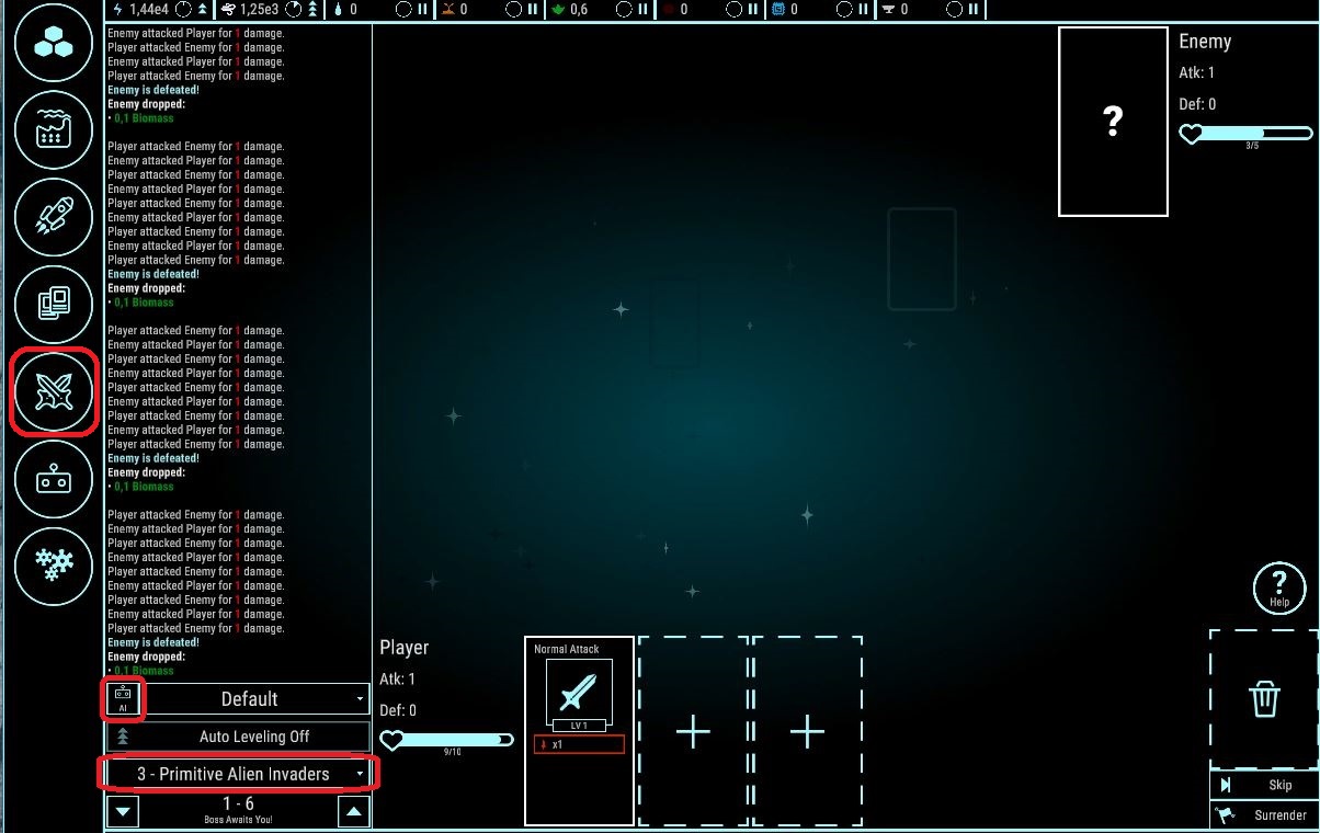 Step two: Switch to the Battle-section, select the Primitive Alien Invaders, now you could play by clicking Normal Attack at your “Hand”, or activate the AI to fight for you.