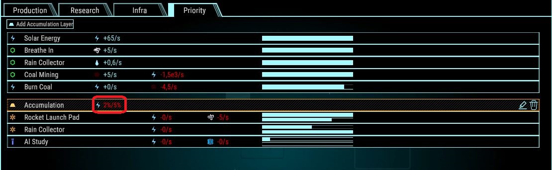 By now coal should be unlocked, you could set “Coal Mining” to ON (Techno-section/Production) that will produce 5 coal/s and adjust “Burn Coal” to 9% (do this by click and hold the mouse button at OFF then drag to the right) this will use 4.5 coal/s, if you already create a layer at “Priority”, don’t forget to move them up
