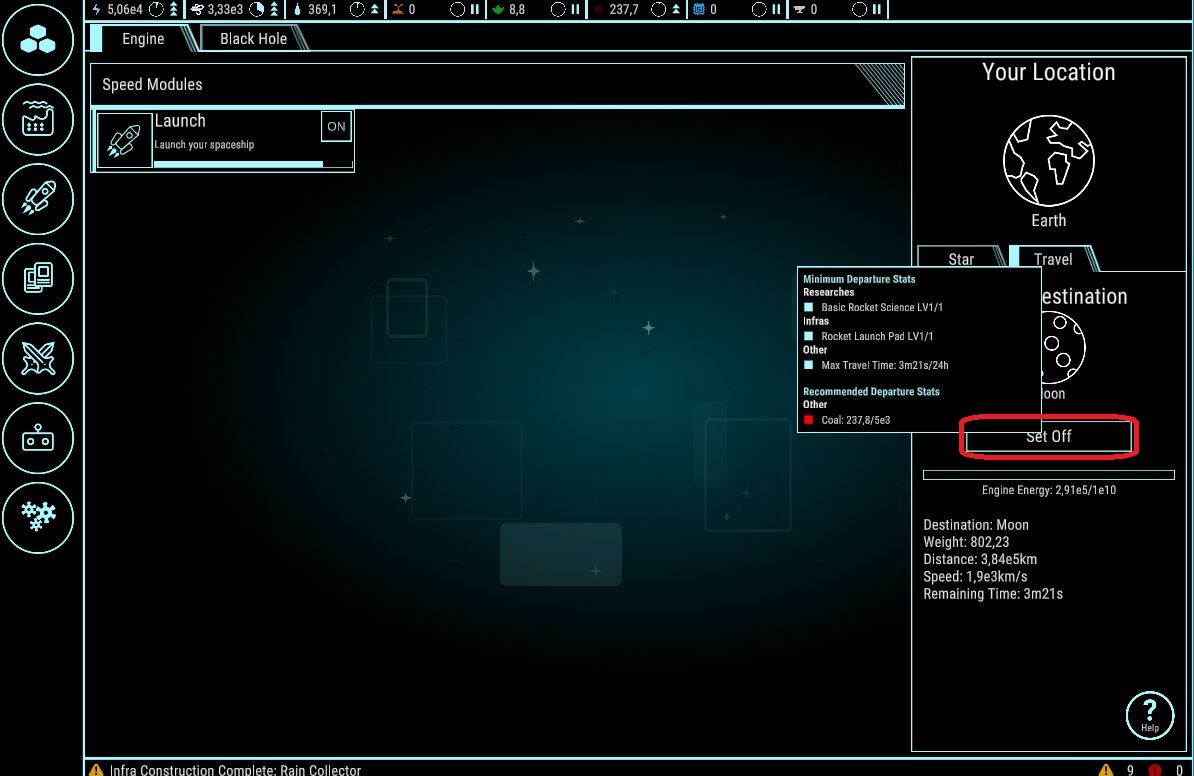 If you select the “Moon” and hover over Set off a little popup will show up with some useful information. As you need more coal, maybe reduce “Burn Coal” down to 5% (you still produce more energy than the coal production drains, but with a higher coal overflow). Just keep in mind, more coal = more weight, so more energy for “Launch” to charge the Rocket (for a shorter flight time to the moon)