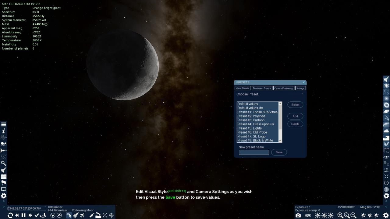 Several keyboard shortcuts will be available then to automatize some tasks not (yet) available in SpaceEngine
