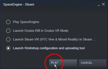 1. From the Steam Library, launch SpaceEngine by clicking the Play button and select Launch Workshop configuration and uploading tool: