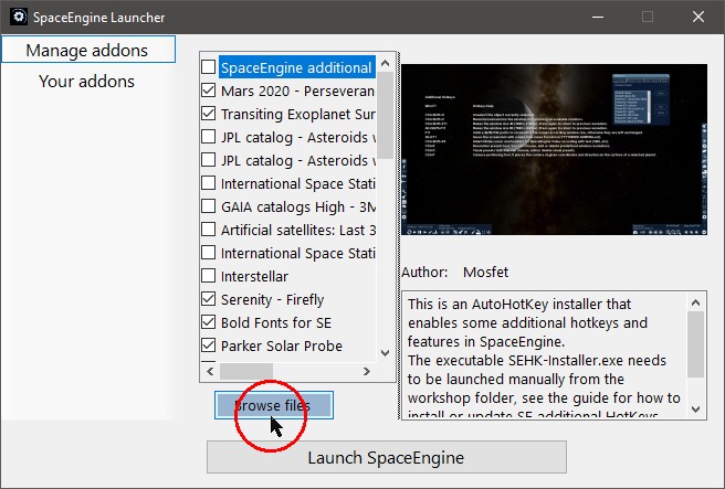 2. From the Manage addons window, select SpaceEngine additional hotkeys, then click Browse Files:
