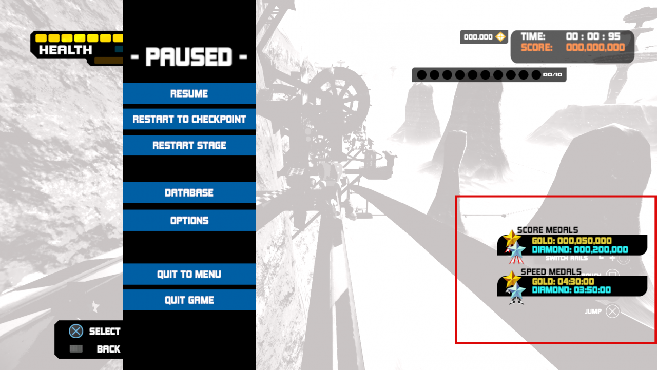 To obtain this medal you’ll need to complete all the time attack challenges throughout the stages. This one is the exact same as the score medals except you will need to finish the stages in a set amount of time. Much like the score medals you can pause the stage to see what the requirements for the gold and diamond medals are.