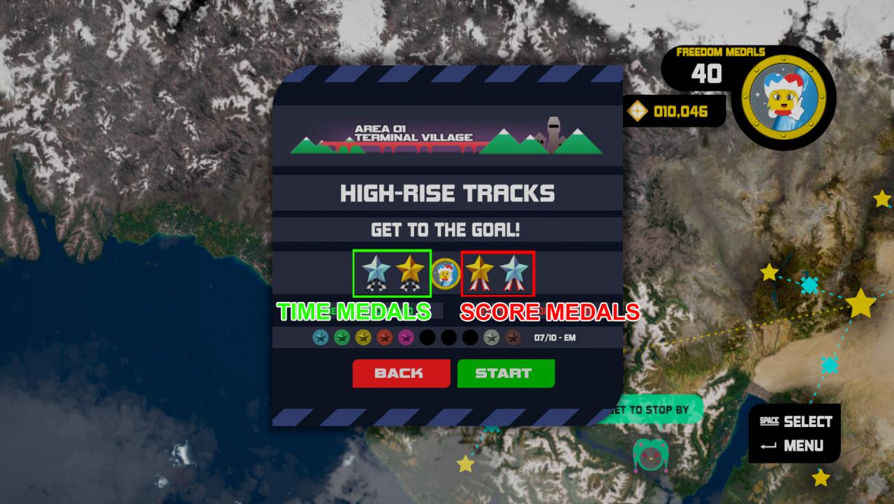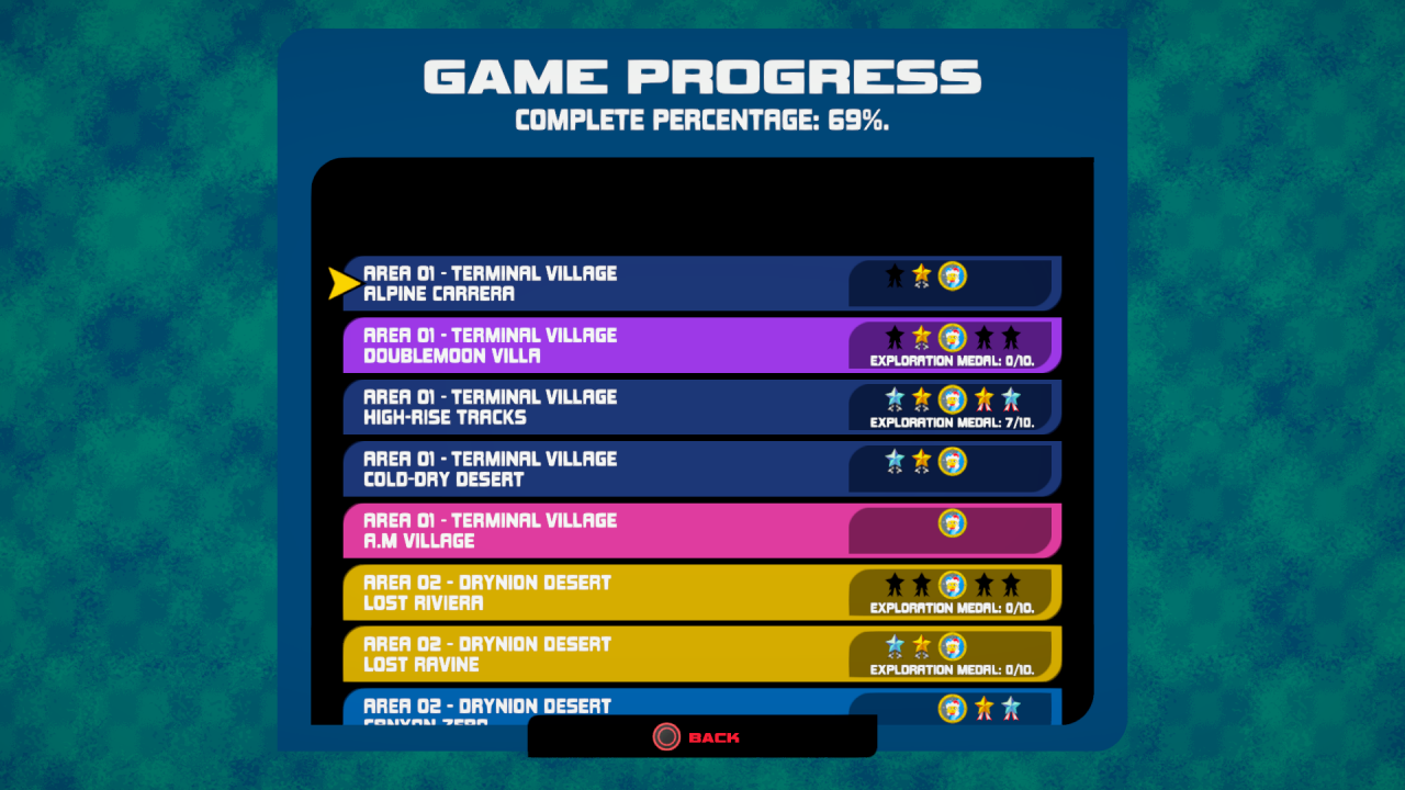 This image shows the stage select menu showing which score and time medals you’ve completed.