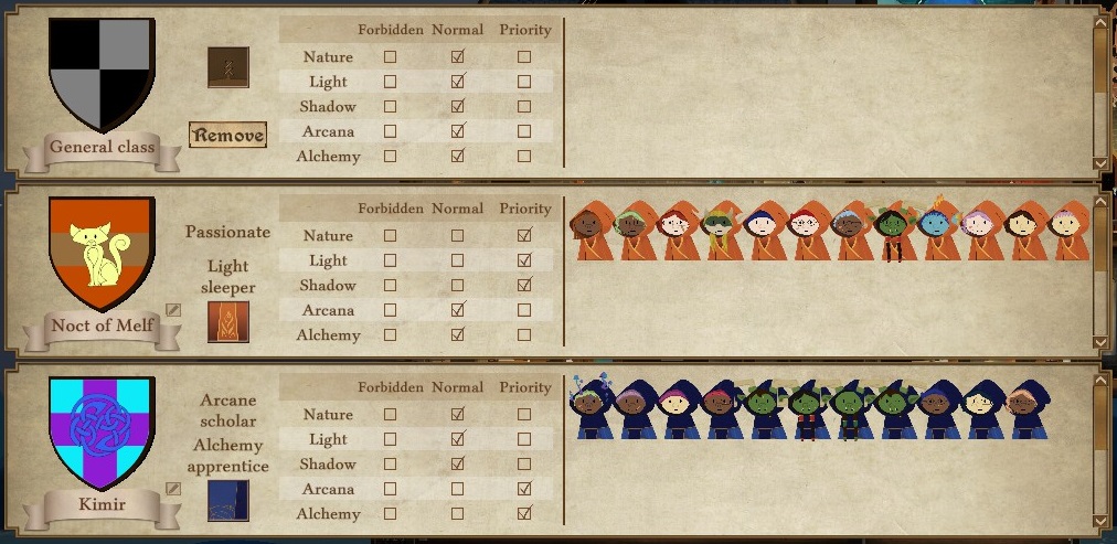 This is great if I need both Alchemy and Arcane magic specialties for a quest, but it is still early game and I don’t know that yet, so this could make getting my quest profession more difficult than it has to be if I need only Arcane or Alchemy focus. (Or worse, none of the three options I have to chose from use Arcane or Alchemy at all!) That second trait could have been a buff like Gourmet, Athletic, or Light Sleeper to get them back into class faster after a break to tend their needs. Also, having no forbidden magic and three priorities on the orange house means that if the Kimir classes are full or not in session they will fill up places in use by the other house’s priority. As the old saying goes: if everything is a priority then nothing is, so if I really want to keep the Orange robes out of the Alchemy and Arcane classes I should just forbid one or both of them.