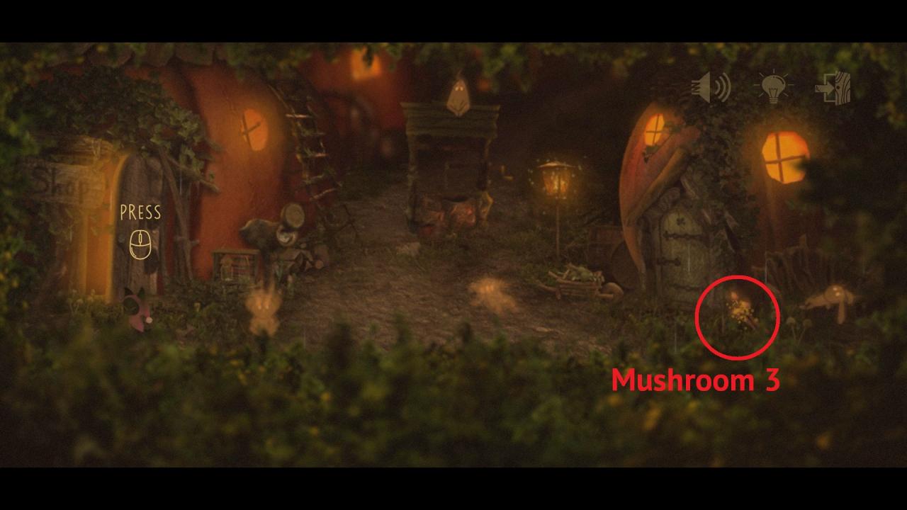 Click on the mushrooms (3/4) in the right part of the screen – you will hear the sound. Then enter the shop.
