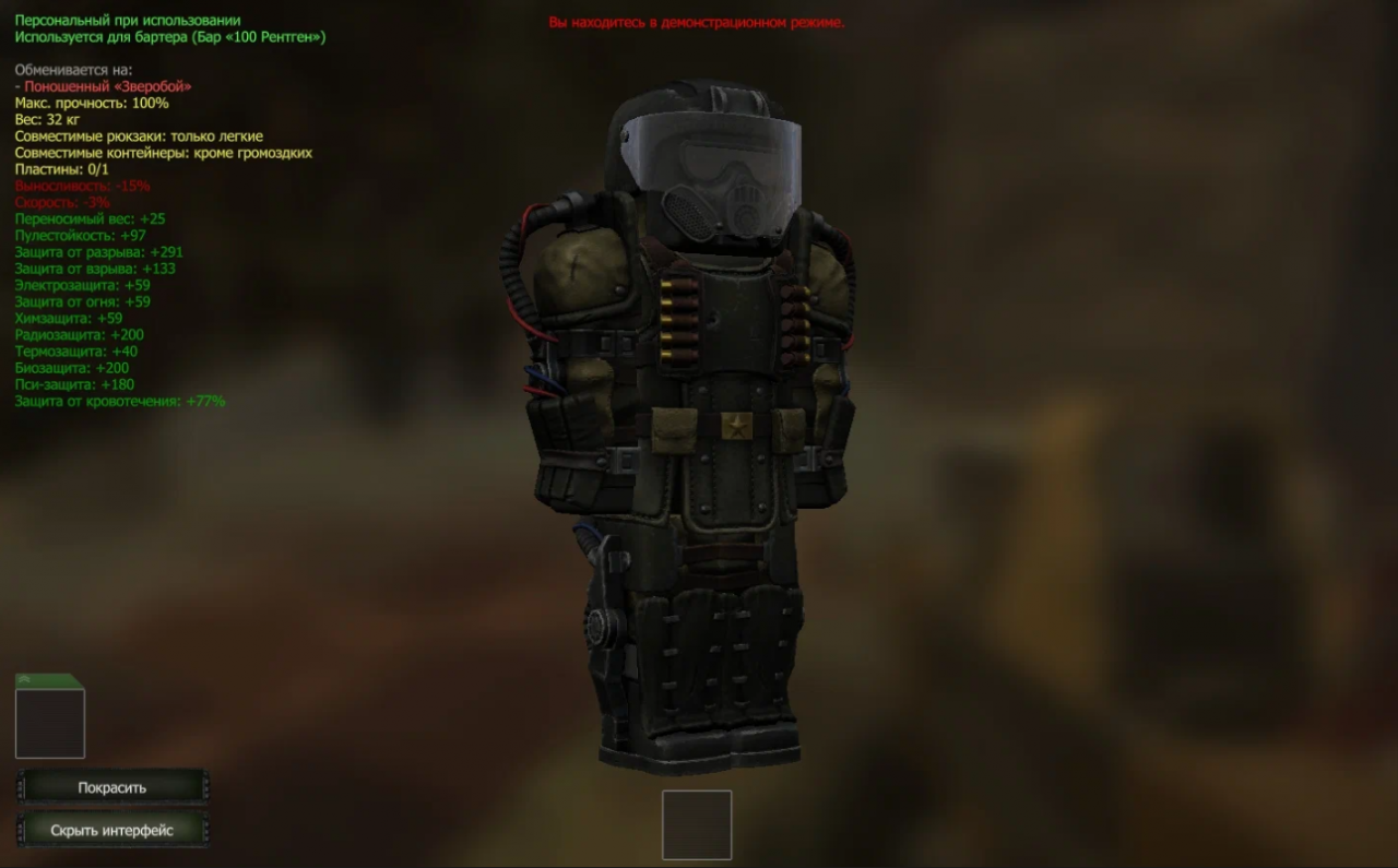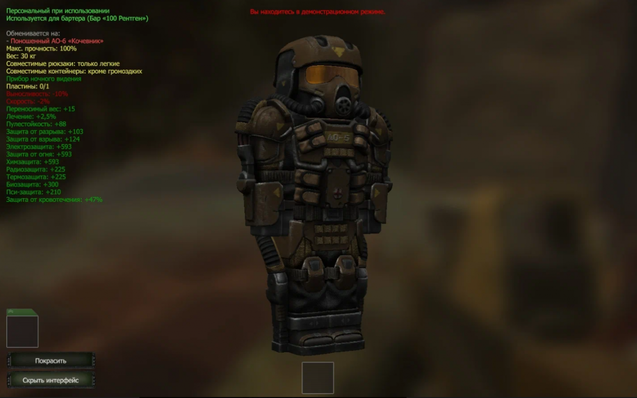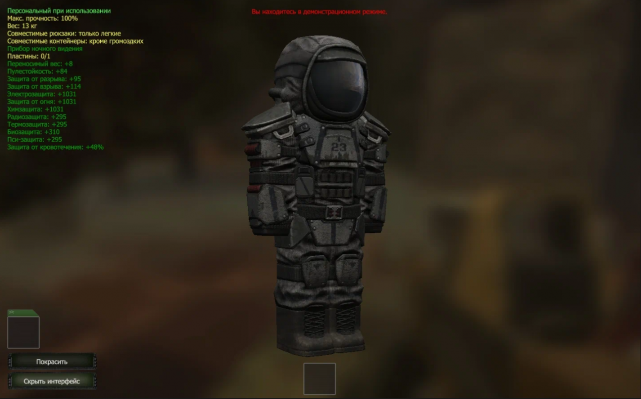 The best suit that combines bullet resistance, infection protection and all kinds of containers. The best development prospect among all barter suits. Slightly worse than the Centurion in PVP, but it has 3 bioinfection (Scat 9b), with the full version, which gives excellent passability in the zone, and also has a better container (lair 6u).