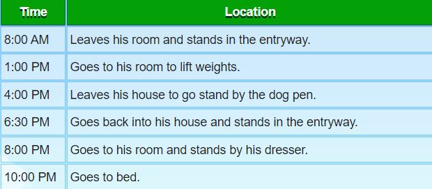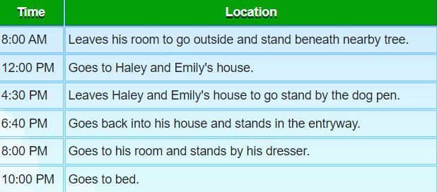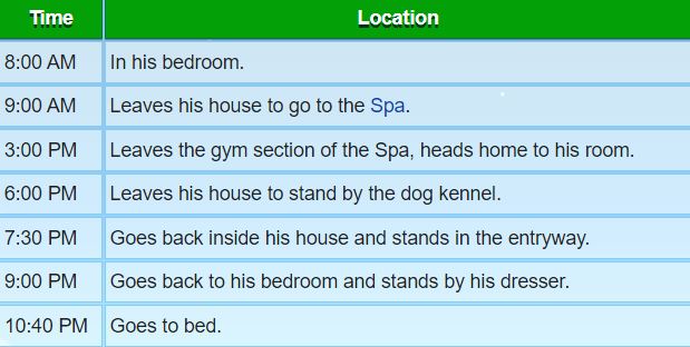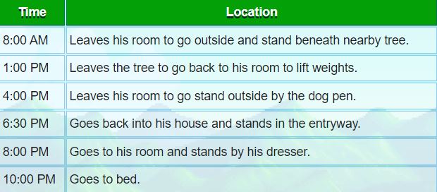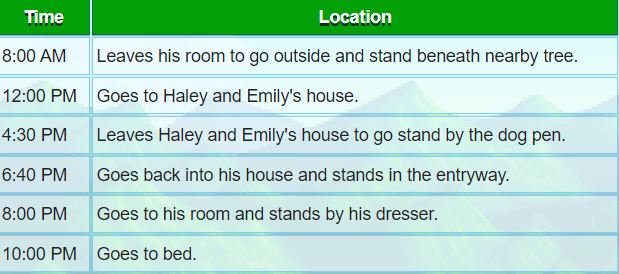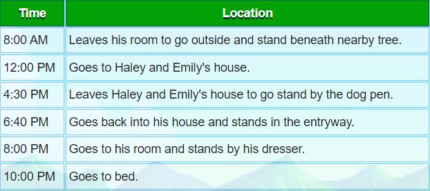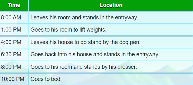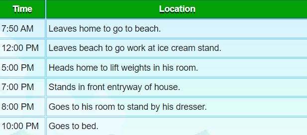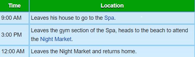 During Summer, he can be found on the beach in the morning and running the Ice Cream Stand to the left of the museum in the afternoon. On the 16th of Summer, he has an appointment at the clinic.