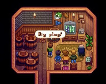 Part 2 can be triggered by entering the saloon. Alex, Kent, Shane, George, and Gus can be seen watching a gridball game in the backroom , half of which has been decorated with gridball memorabilia and a TV. The other half still has barrels, and storage.The player walks in, and Alex tells the player that although his dream of going pro may not have been realised (though he assures the farmer that he’s happy with his life now), this is a small way of realising it. Kent adds that it takes his mind off things, and Shane agrees. Gus tells the player that watching the game is good for business, too. The cutscene ends with the player saying that the guys have a new tradition now and that the 5,000g was well spent.
