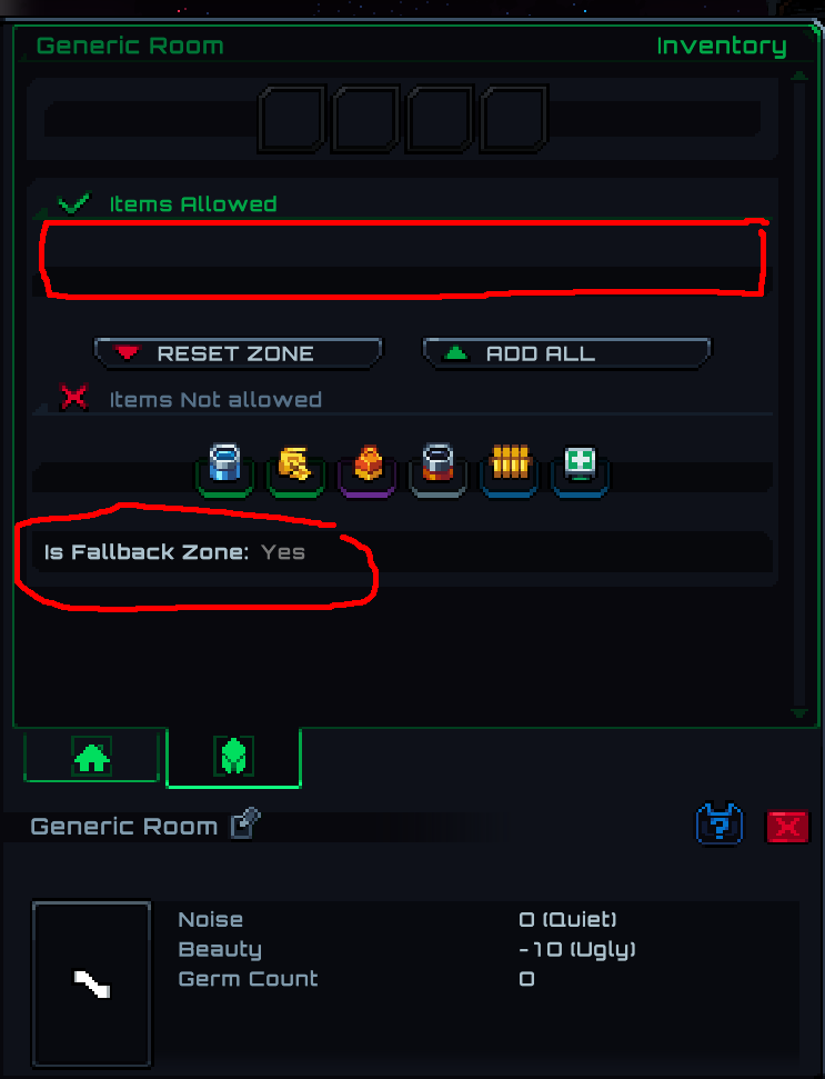 As long as NO items are allowed, “Is Fallback Zone” will be set to YES. That means that if an item doesn’t have a better place, colonists will drop it here.