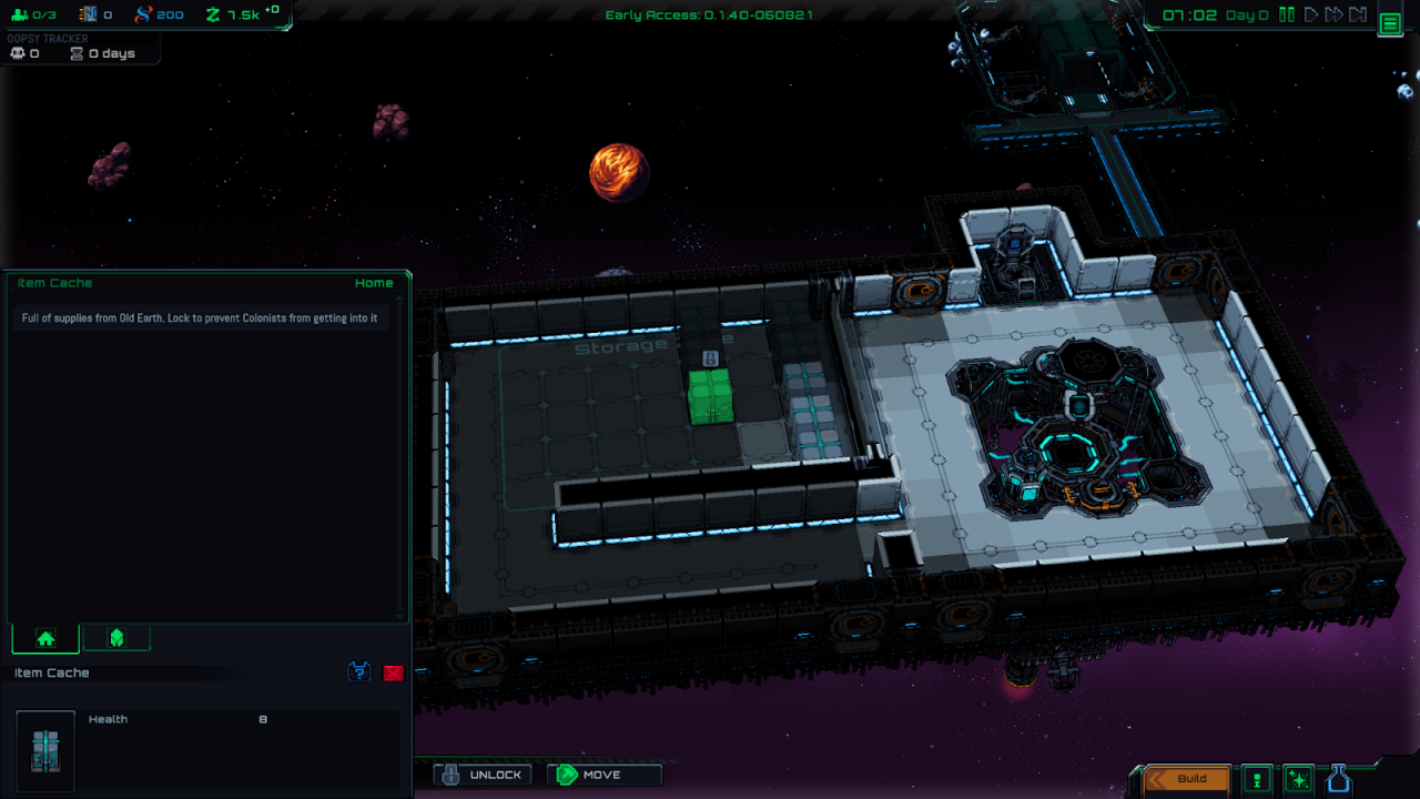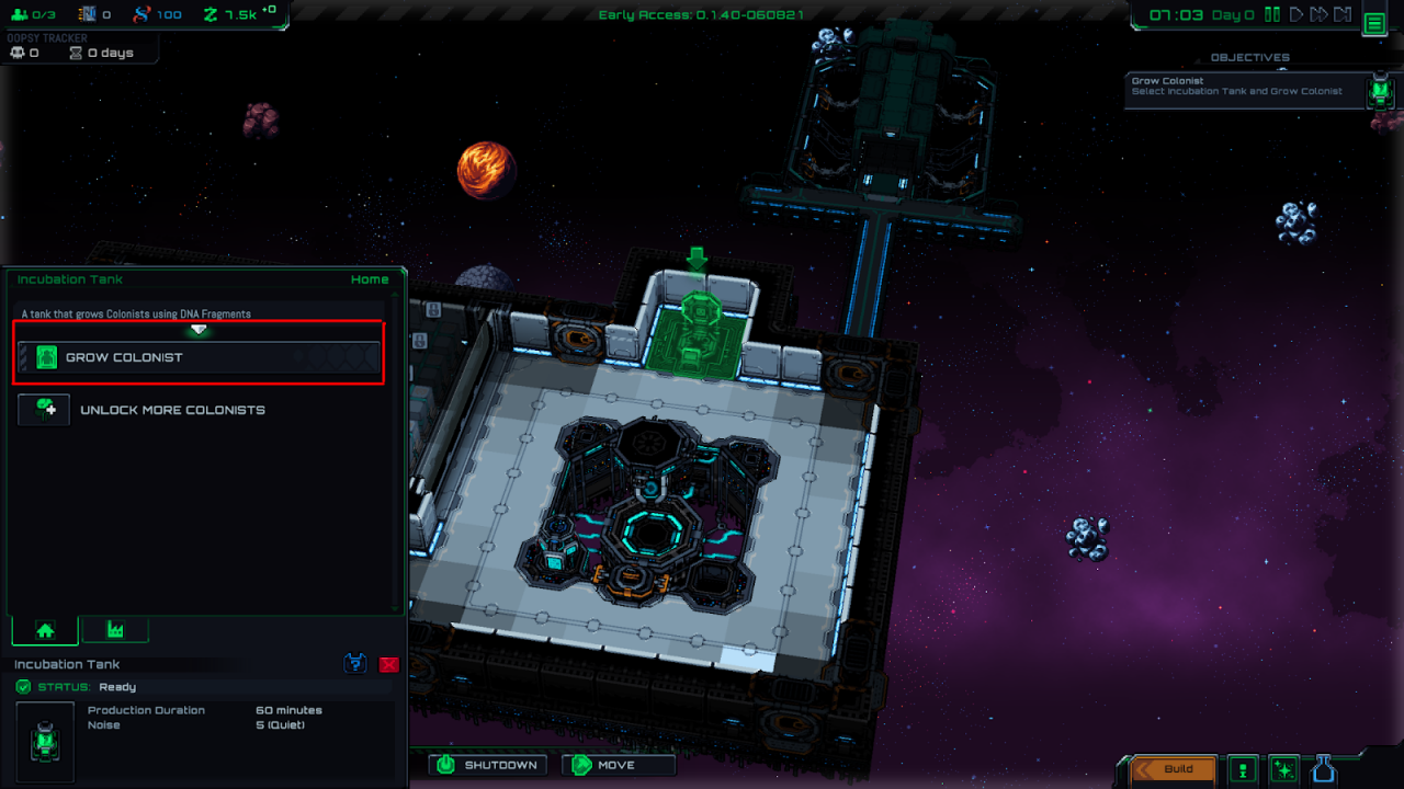 There should be a green arrow pointing to the incubation pod. This is where you can generate new colonists. Left click on it, and then in the info panel, you’ll see a button to “Unlock More Colonists.” Click that too.