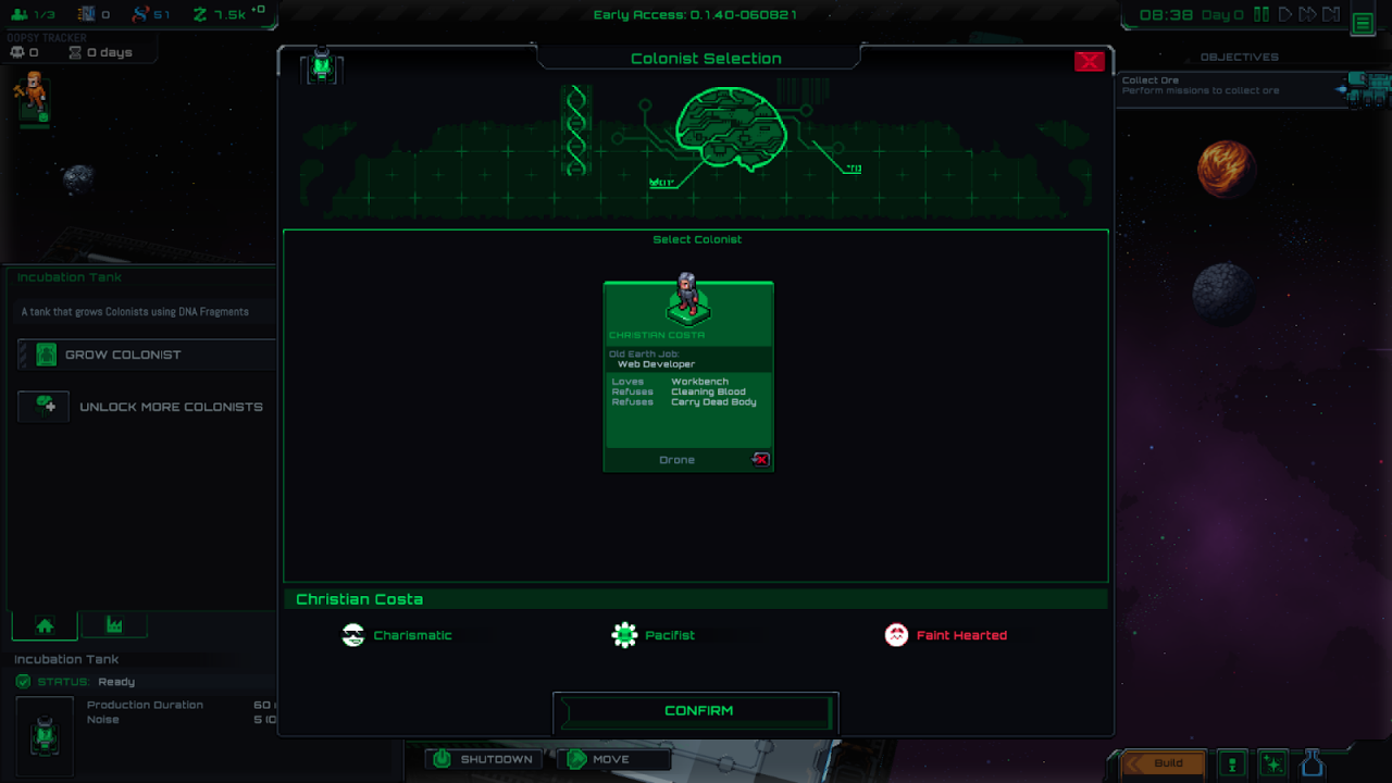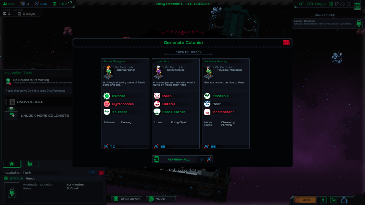 Bear in mind that every colonist has a DNA cost. You pay this when you first buy the colonist, and it doesn’t cost anything to grow them after that – so if someone dies, you can get them back without spending DNA again. Generally speaking, the fewer drawbacks and more positive traits a colonist has, the higher their DNA cost will be.