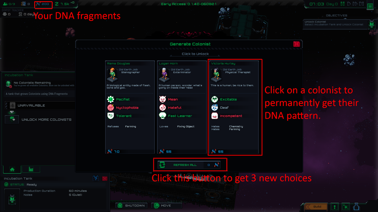 Finally, there’s the DNA cost. We only have 200 DNA to start out with, but we can have up to 3 colonists alive at once. Our colonist Joe here is pretty bad, so he only costs 15 DNA, but that’s still a waste that we could put toward someone better.