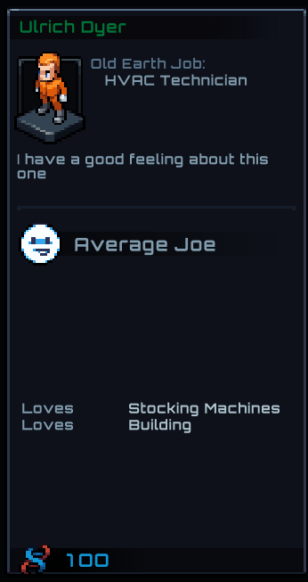 I picked this guy because he loves Building and Stocking Machines, which are both pretty common tasks. And he doesn’t have any refused or hated tasks, so he’ll do almost anything.