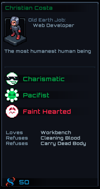Below the traits we have a list of tasks the colonist has feelings about. Pay attention to these, they will matter a lot. Performing loved tasks will improve a colonist’s morale, while hated tasks will decrease their morale. If they are listed as “Refuses” the task, that means they will not do it under any circumstances. For your first few colonists you should look for people who don’t refuse or hate anything, because you won’t have a lot of other colonists who can pick up the slack.