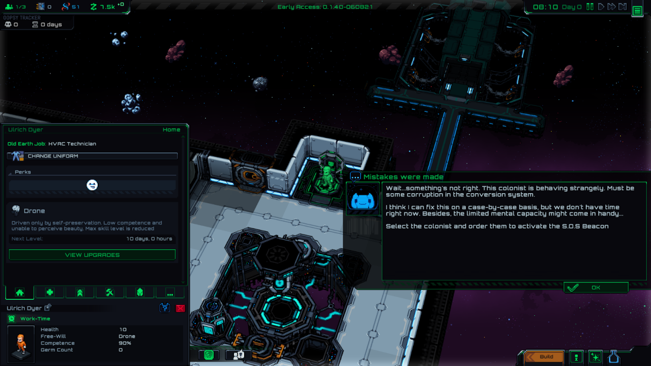 4. If someone’s morale is low and seems like it will get worse, you can try to kill them before they get so angry they stop listening to you. Just order the colonist back to your Analyzer (“Return to Source”) and you can re-grow them at your convenience. They’ll lose a bit of skill but it doesn’t really matter.