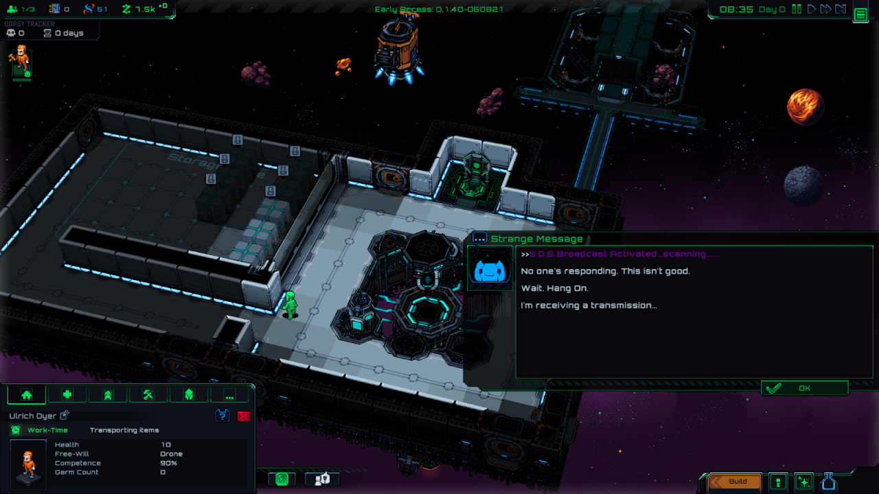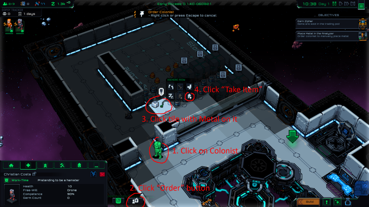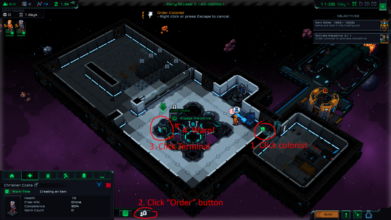 Troubleshooting: It seems like issuing orders is a little buggy right now and sometimes they don’t listen properly if they were already moving to do something else or have just spawned. If they don’t go to the terminal right away, try canceling the order, clicking away from the colonist and then clicking on them and issuing the order again.