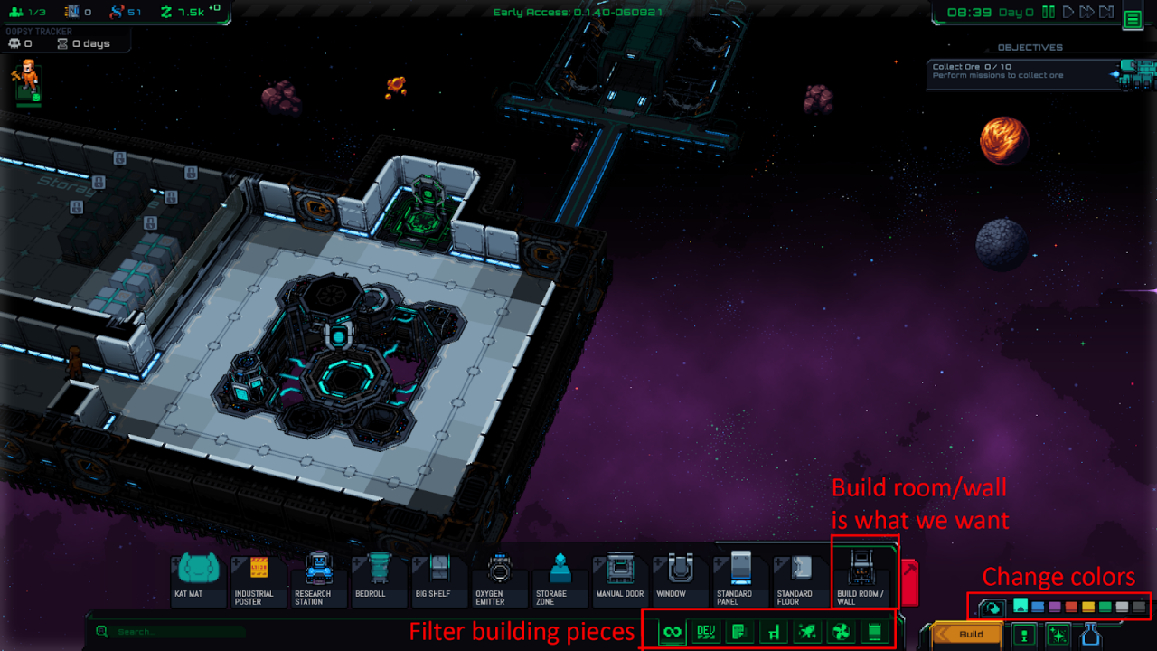 TO BUILD ROOMS: Click down on a tile that you want to be one corner of the room, then hold and drag to draw out a room with walls and floor quickly. You can also place walls one by one, or draw floors only using the “Standard Floor” building piece instead of “Build Room/Wall” – but it’s easiest to build the room all at once by clicking and dragging.