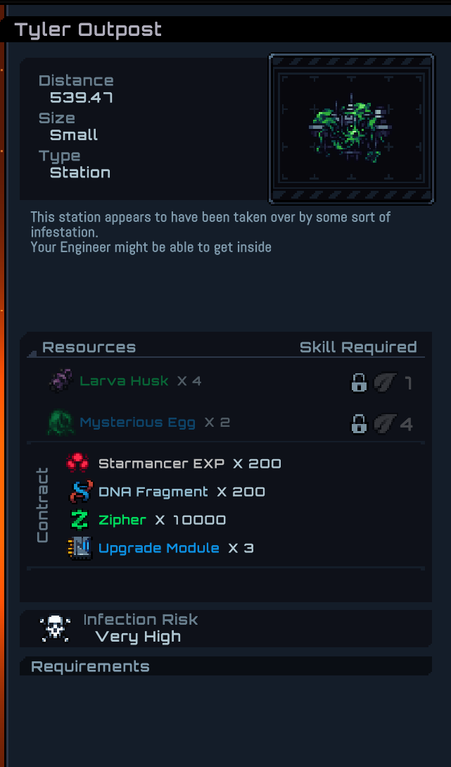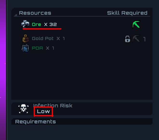Look at the brown asteroids. Find one that has a “Low” infection risk (Very High = more dangerous) and some Ore available in the resources.