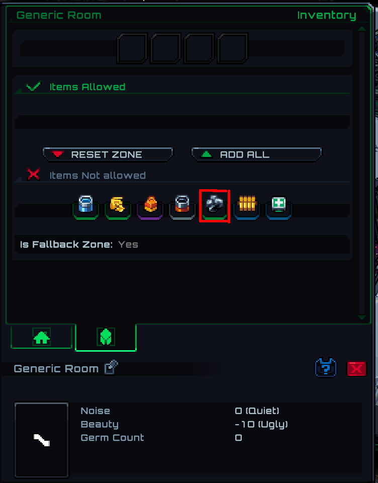 You’ll see a box on the left side of the screen pop up with information about the room. To know about the storage zone, we want to go to the “Inventory” tab, which is the 2nd one: