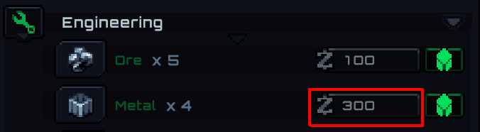 Scroll down to find the Engineering items section, and click the button with the Z icon next to it. (This is how much each unit sells for, so 300z per Metal):