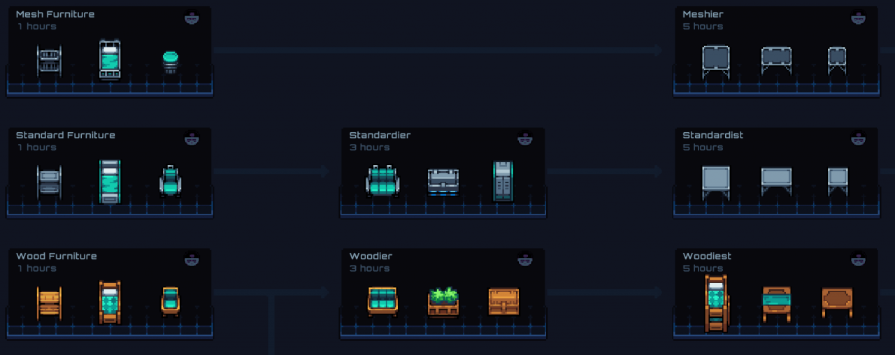 Decor is useful to build early and makes your base much more pleasant to look at. I like the Standard or Woodier lines, colonists can sleep and relax on the couches from the middle tier upgrade and they’re pretty cheap to build.