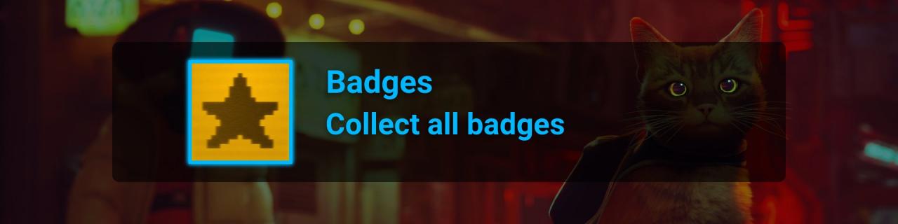 The Badges are stickers on the side of the cat’s backpack, the first of which can be unlocked in Chapter 4. They have unique designs so you can tell them apart to narrow down which one you are missing