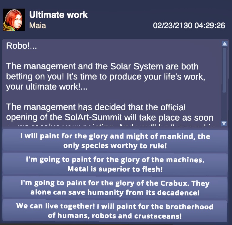 Here, the answer you give is what decides which ending you’ll get, the “mankind” ending, the “Metal” ending, the “Crabux ending or the “brotherhood ending”