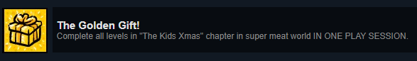 To complete this achievement, you need to beat all 5 levels in “The Kids Xmas” chapter in Super Meat World, in one play session. This means you cannot exit the game until you complete them all. I don’t think you have to beat them chronologically, but I still recommend that you do. You can stay focused and you’ll get less frustrated. When I did it the first time (not in order) I didn’t get the achievement, but after doing them in order, I got it. That’s why I think it’s just better to play it safe. You definitely don’t want to beat this more times than you need to.