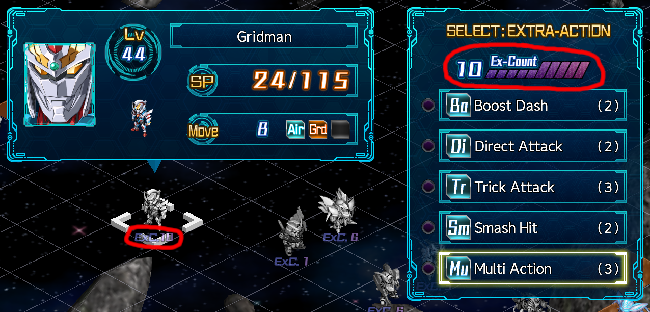 An Ex Action (or Extra Action) is a command usable thanks to the “Ex Action” command when you select a friendly non-battleship unit. To use them, you will need the ExC points, that you will get by killing enemies, by leveling up your units, by using some items (like “ExC Boost”, or the “Kaiju Figurine”), by using the Spirit Command “Resolve” (+5 ExC) or thanks to the battleship’s extra order “Boost ExC” (+2 ExC to a target unit).
