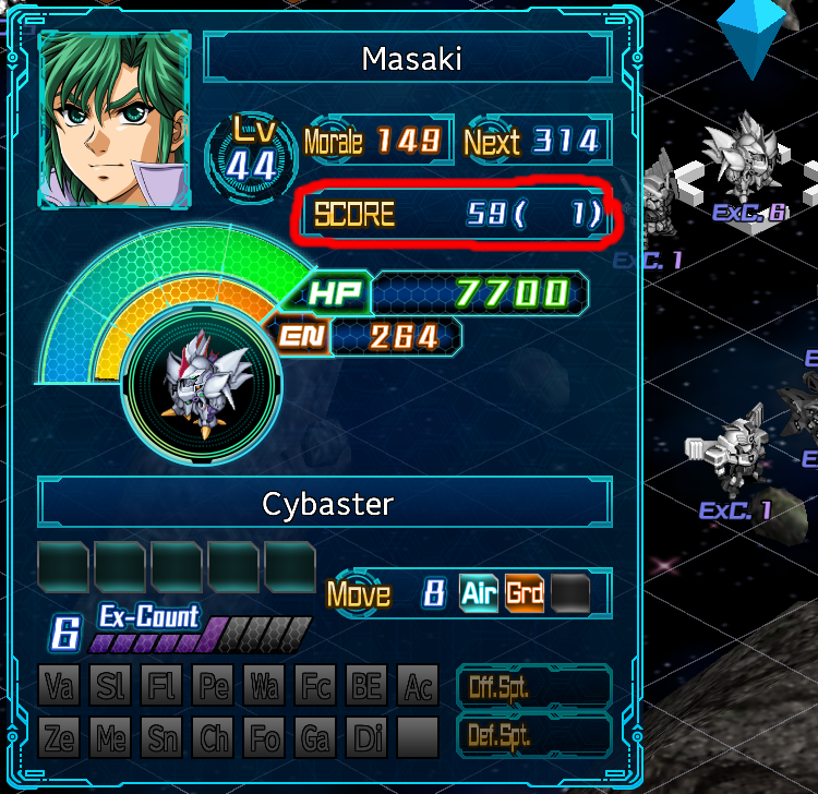 “Daunt” is the key here – is a Spirit Command that can reduce the morale of an enemy unit by 10. Considering that, normally, the starting morale of any unit is 100, to reduce it to 50 you will need to use Daunt 5 times. Several pilots have this ability but, among the “main” units, perhaps the best is Ernie, the Ikaruga pilot, because his has a relatively low cost (30 SP) and, being the main (and only) pilot, you can easily restore his SPs with items like Special Dog, Fahrenian Peach Bun or Mecha Geek’s Spirit.