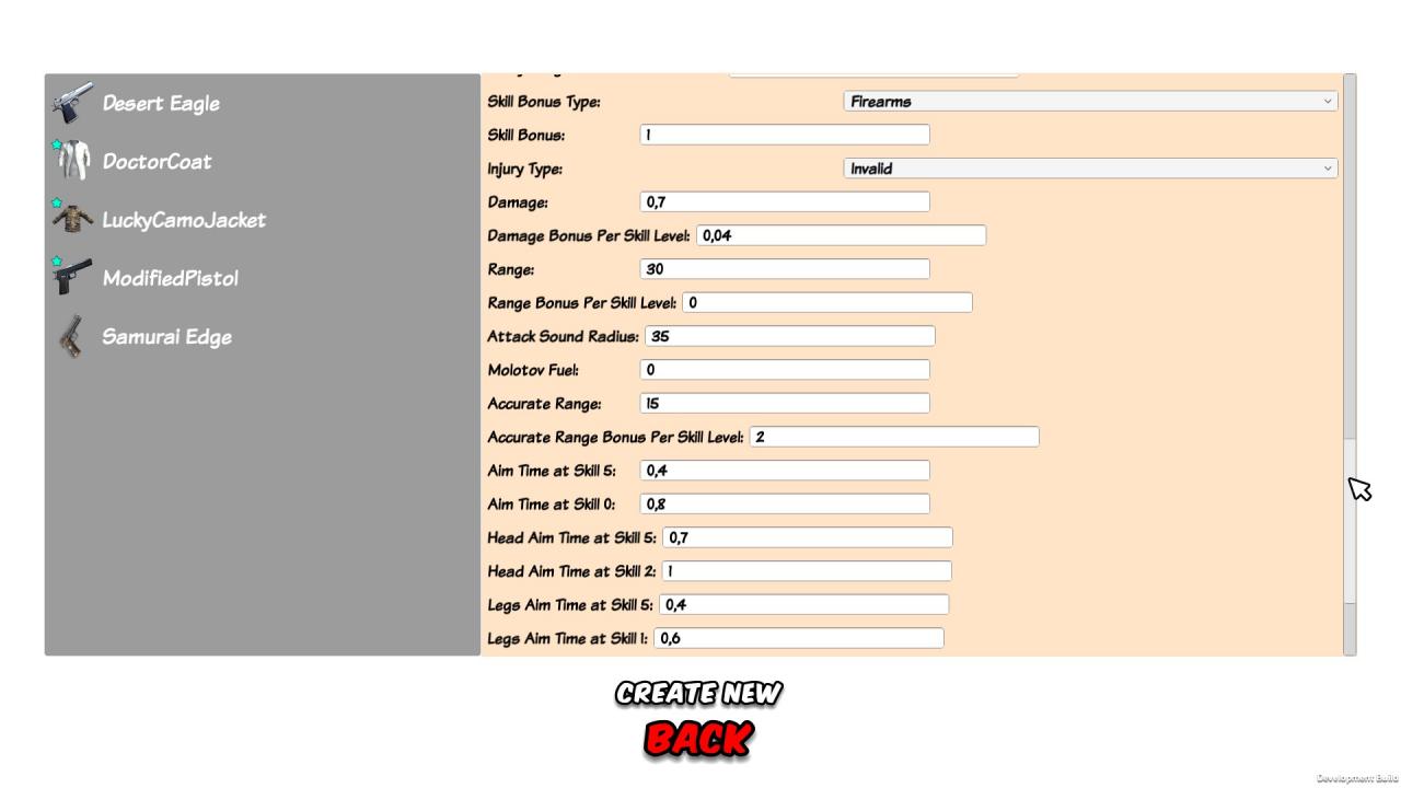 - Accurate range bonus per skill: Put a value if you want the weapon to have a bonus from stats. I’ll put 2 so at firearms with 5 stars the optimal range for the weapon will be 25 mt.