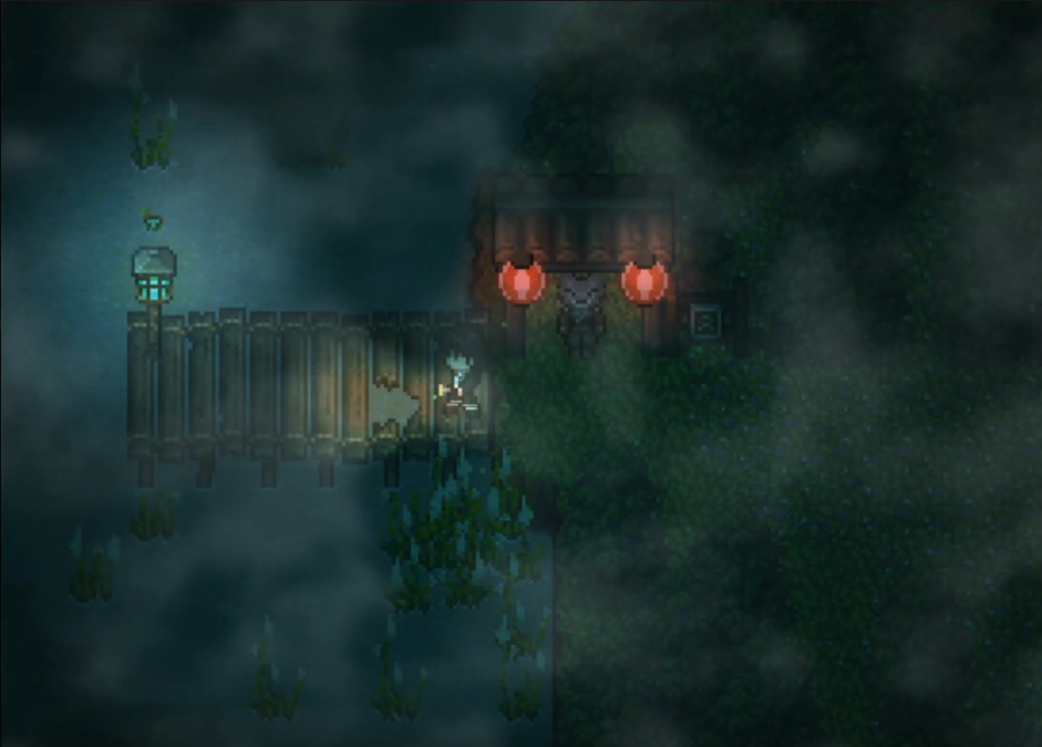 Final area, before leaving. The fox will stay asleep until you change the time. To proceed you need to walk next to the broken piece of the bridge, and interact with the lantern at the end. Then go back to the (!) in Area 3, i.e. the axe, bring it to Area 4 and use it on the bridge then interact with the lantern to change the time back to day.