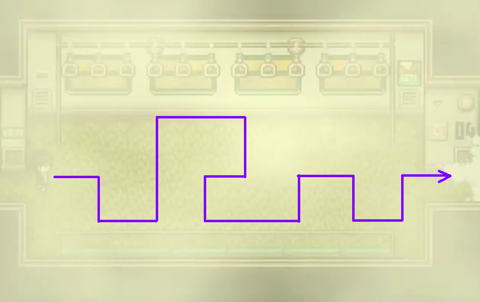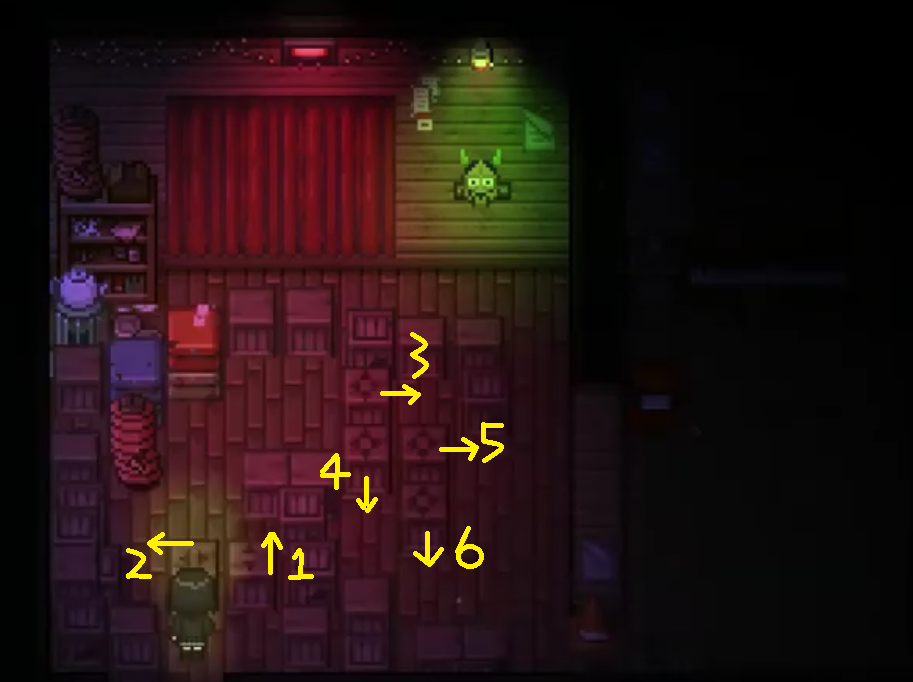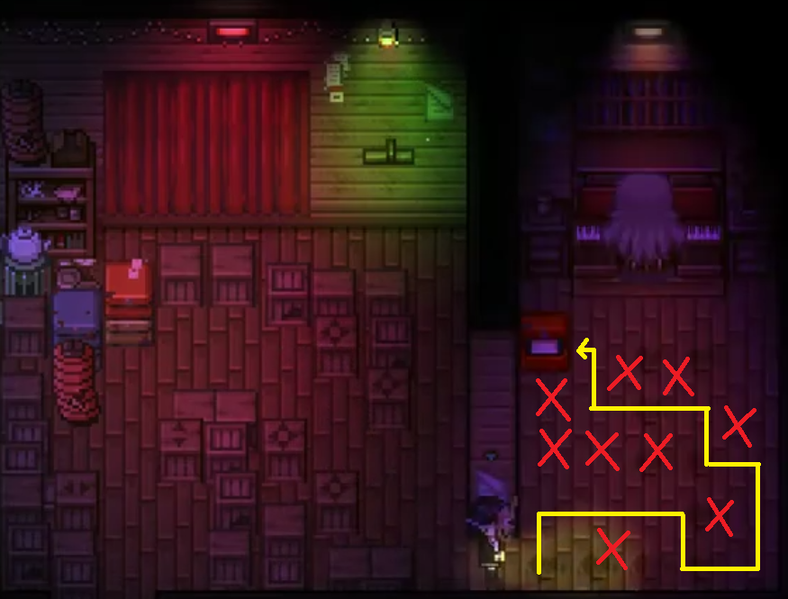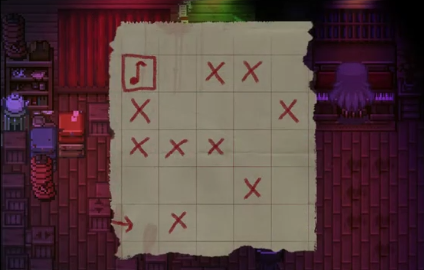 Yes, it is not 100% to scale, but it should suffice. To walk it would be (from the note): one right, one up, two right, one down, two right, two up, one left, one up, two left and one up. Face left and interact with the box to get the Music Score. Also, if you mess up you will not die, it will just reset you back to the note. After the scene return back to Sanmai and give him the score. Now head out of the room, back into the main hall and talk with Karasumi, and he will give you a key to the office on the first floor. Go to the office, it is in the same passage that connects to the prop room, you can now interact with a couple items in the office, and once you are ready use the radio to go to the past.