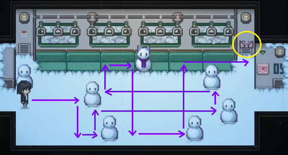 Easy enough, especially if you have played any ice mazes in Pokemon games. Solution is: Right, Down, Right, Up, Right, Up, Left, Up, Right, Down, Right Up and Right. Interact with the poster to trigger what to do next. You can interact with the frozen door for a little dialogue. Head back to the third cart, the one with the big sleepy cat. Now talk with Rin-chan and take the poster off the wall.
