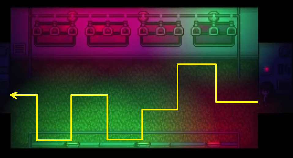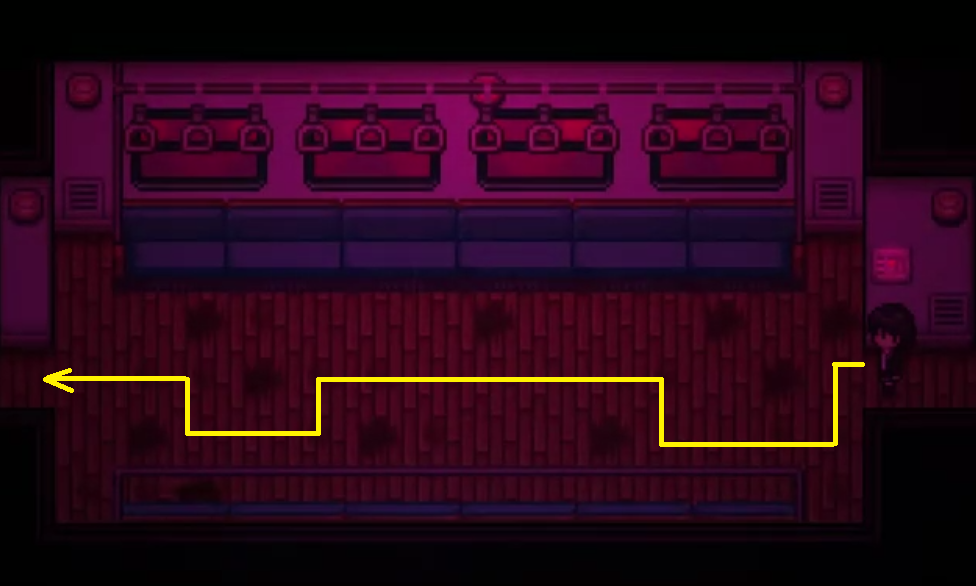 The hint from the previous carriage was to follow the green lights. Just be sure to sprint, as Yamada will enter the room.