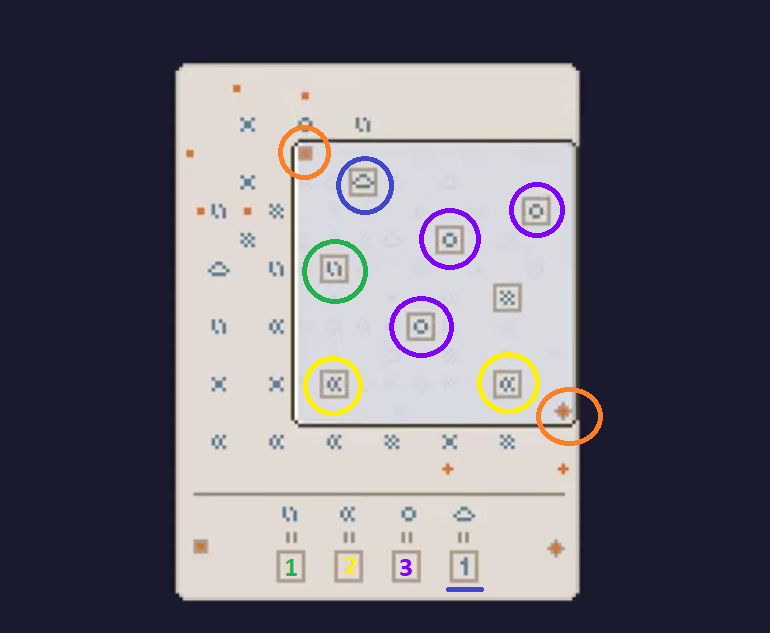 For the last puzzle, make sure the two orange corners are filled. The hint is also the triangle is one, meaning containing only one. All you need to do is count how many of each symbol there is, then the number of each symbol, in the symbol’s order is the code.
