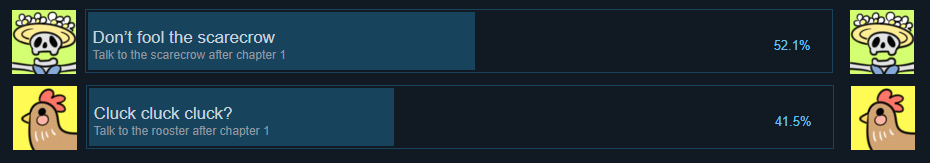 As I discussed in the walkthrough, after completing Chapter 1, before continuing, backtrack to the village and talk with both the Scarecrow and Chicken to get their respective Achievements.