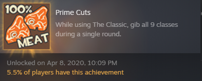 Remember, you have to gib all 9 classes, not just kill them.ย The only way to successfully gib an enemy is by killing them with a full charge.ย Be cognizant of how much health each class has. Honestly the hardest part of this achievement might be remembering how many different classes you have gibbed in the round.