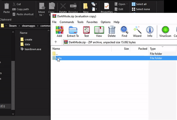 Next, you want to navigate to C:\Program Files (x86)\Steam\steamapps\common\Teardown (your Teardown folder) and replace the data inside the Teardown folder with the data inside of the zip.