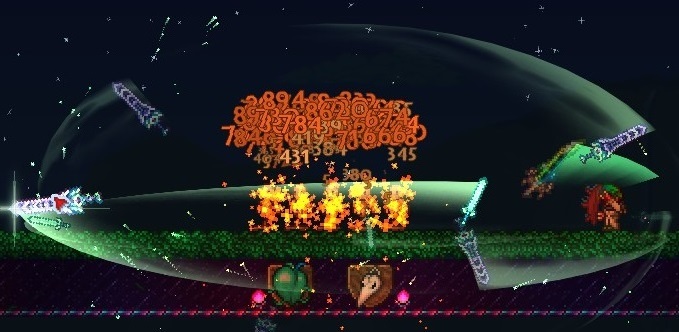 When used, the sword sprites of its component swords fly towards enemies within a 20-tile radius of the cursor, and circle back in quick, frenzied arcs. These pass through solid blocks, and three swords will appear per use (at base melee speed). Each sword sprite deals the weapon’s full damage