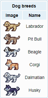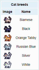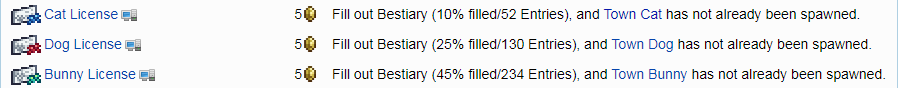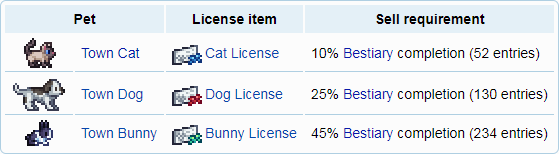 Town pets are special town NPCs that appear at dawn (4:30 AM) the day after a pet license item sold by the Zoologist is used. They are not to be confused with pets, which follow the player around. Town pets have distinctive housing assignment banners, and can share houses with another NPC. They count as NPCs for Pylon requirements and for decreasing enemy spawn rates in an area, but are not counted as neighboring NPCs in other NPCs’ happiness calculations, and indeed do not positively or negatively affect the happiness of other NPCs in any way. Unlike other NPCs, town pets have no means of self-defense.